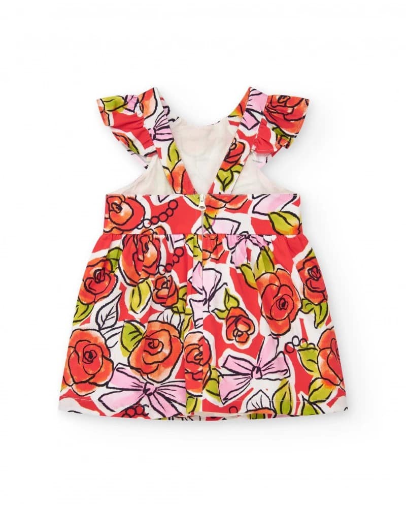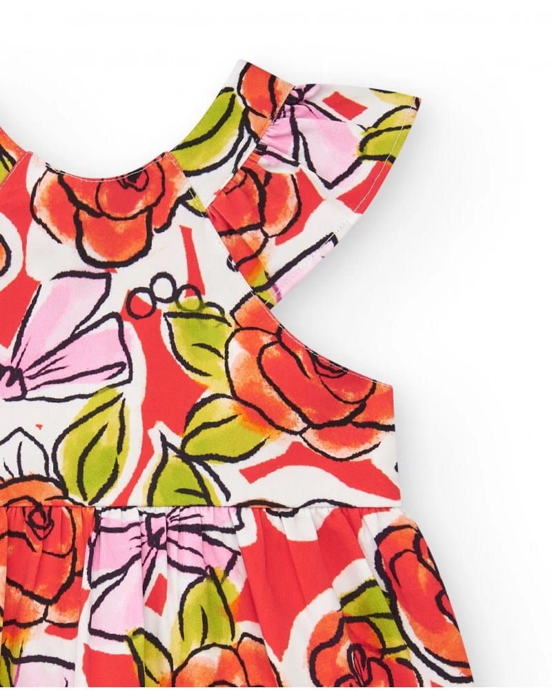 Kleit tüdrukutele, mis on kaunistatud mitmevärvilise lilleprindiga. Sellel on volangidega varrukad.