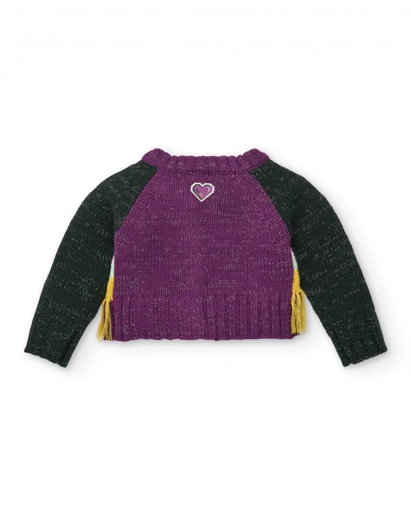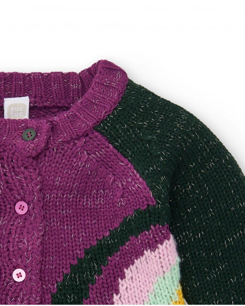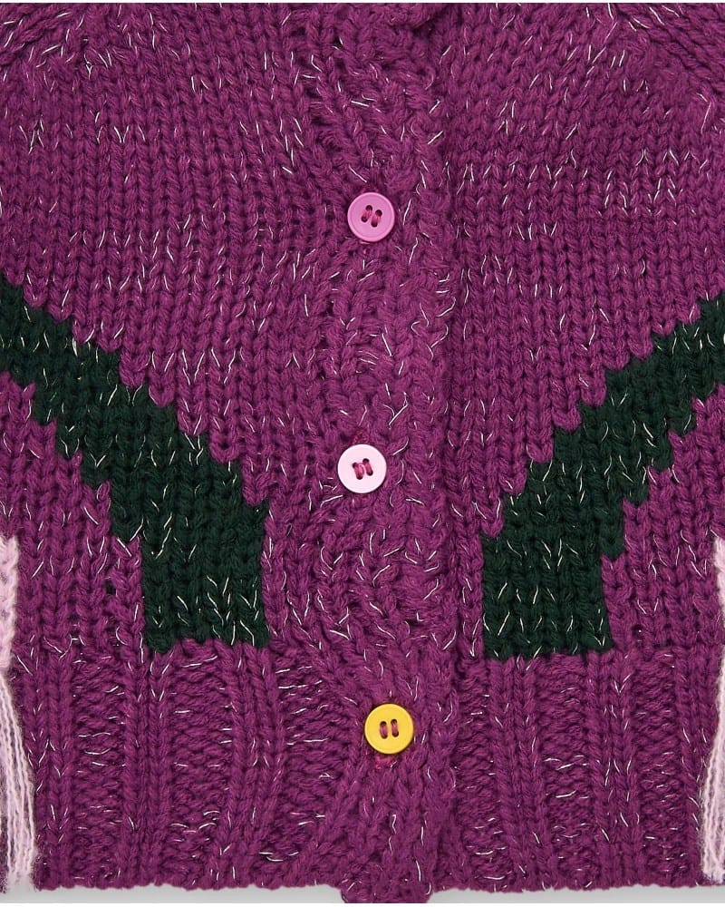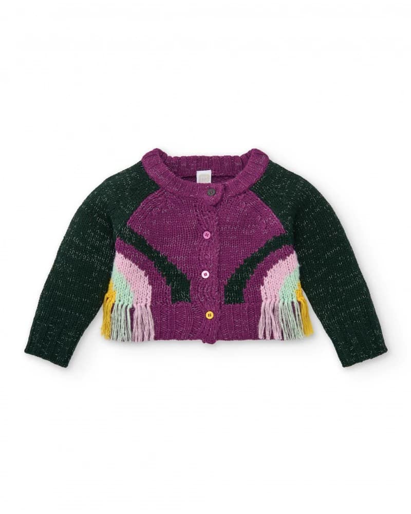 Tumeroheliste varrukatega võluvas lillas toonis kootud jakk tüdrukutele, mida kaunistavad pastelsetes toonides narmasdetailid, mis lisavad lõbusat ja omanäolist hõngu. See nööbitav jope sobib ideaalselt teie väikese tüdruku soojaks hoidmiseks jahedatel päevadel, pakkudes stiili ja mugavust. Unikaalse disainiga, mis paistab silma igal juhul, sobib seda suurepäraselt kombineerida tema lemmikriietega.