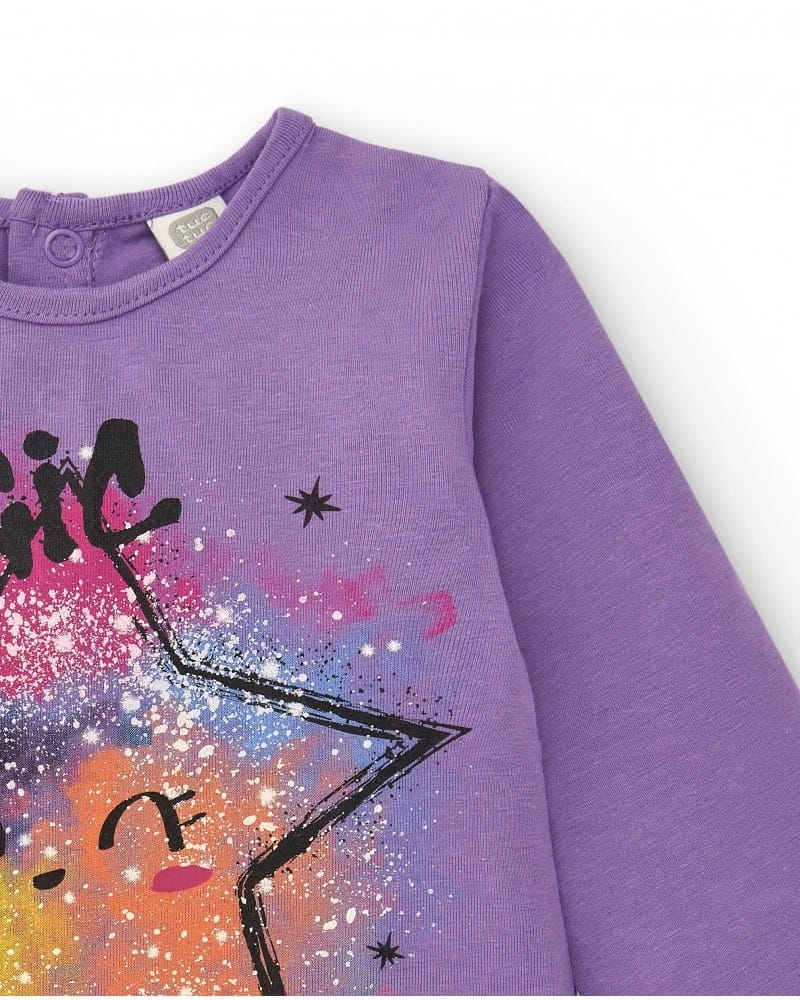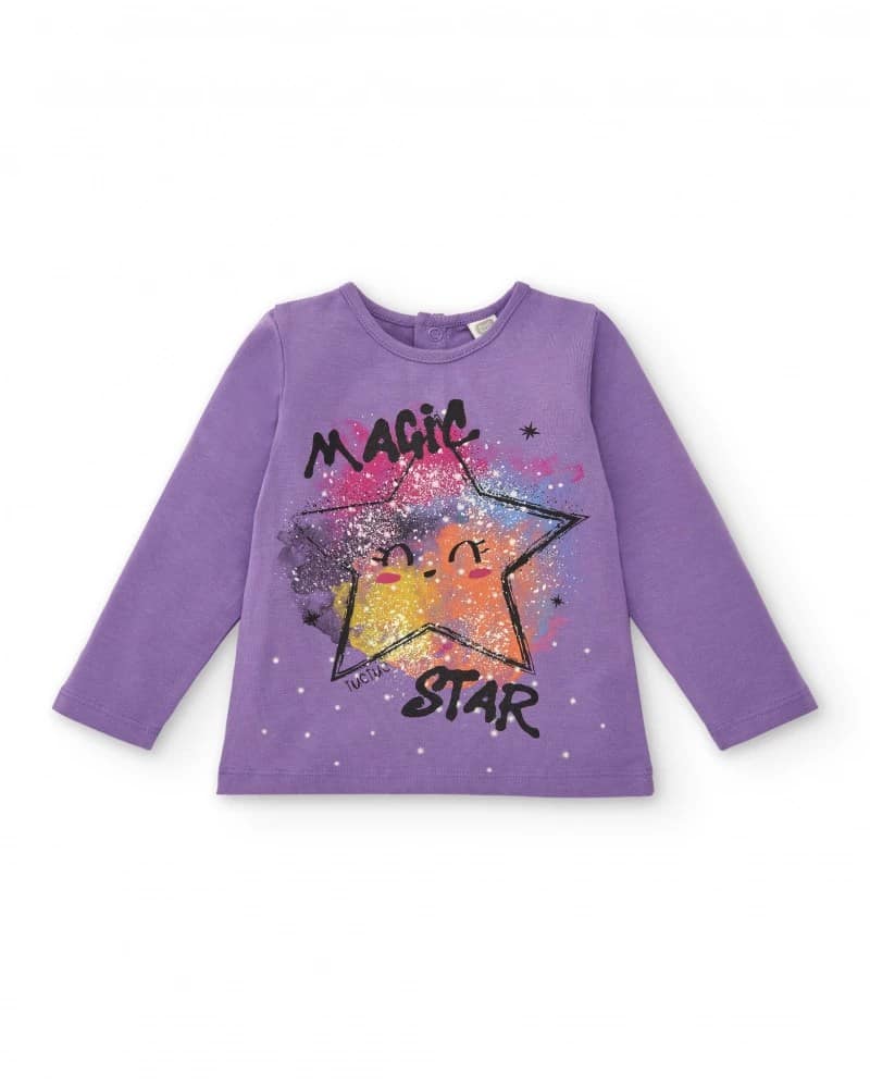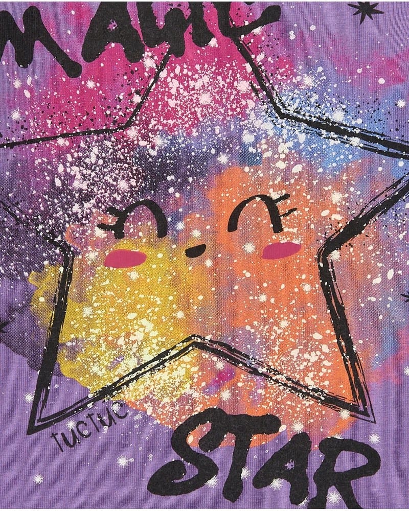 Lilla T-särk tüdrukutele, mis on kaunistatud võluva maagilise tähetrükiga. See pehmest puuvillast valmistatud rõivas sobib suurepäraselt väikeste laste igapäevaellu mugavuse ja stiili toomiseks. Värviline ja lõbus disain muudab selle ideaalseks valikuks igaks sündmuseks.