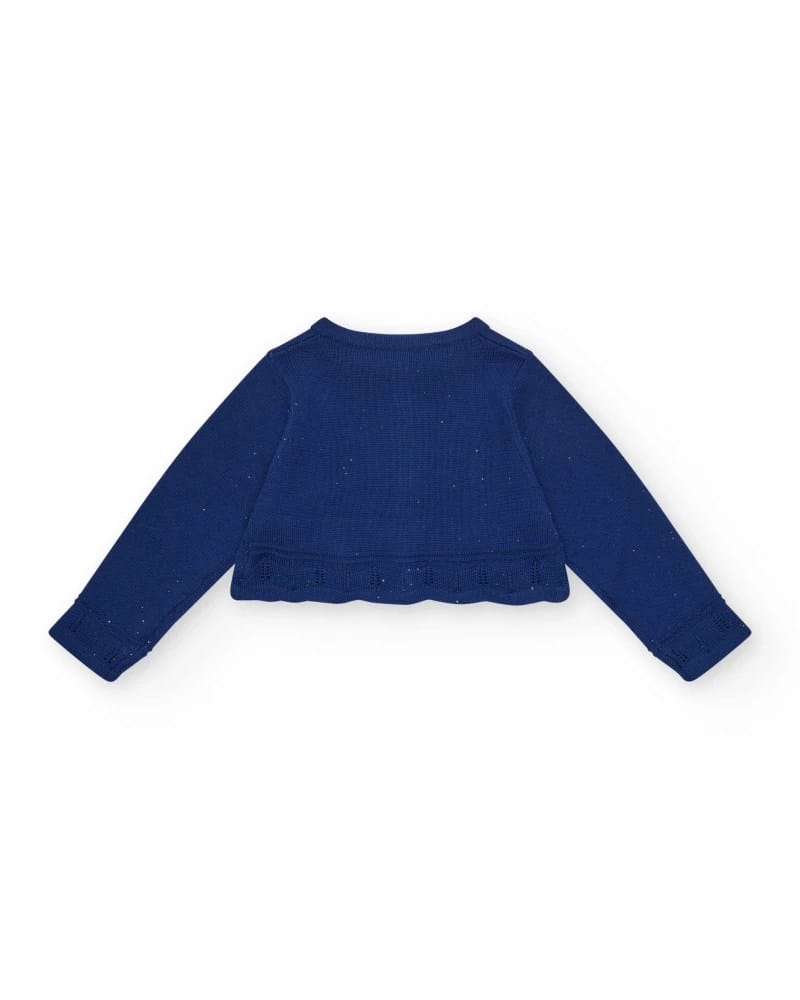 Lühike kootud jakk tüdrukutele, tumesinine ümara dekoltee, nööpide ja dekoratiivsete detailidega.