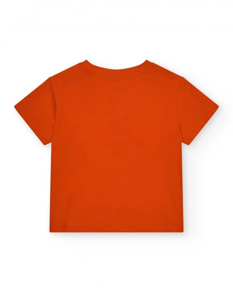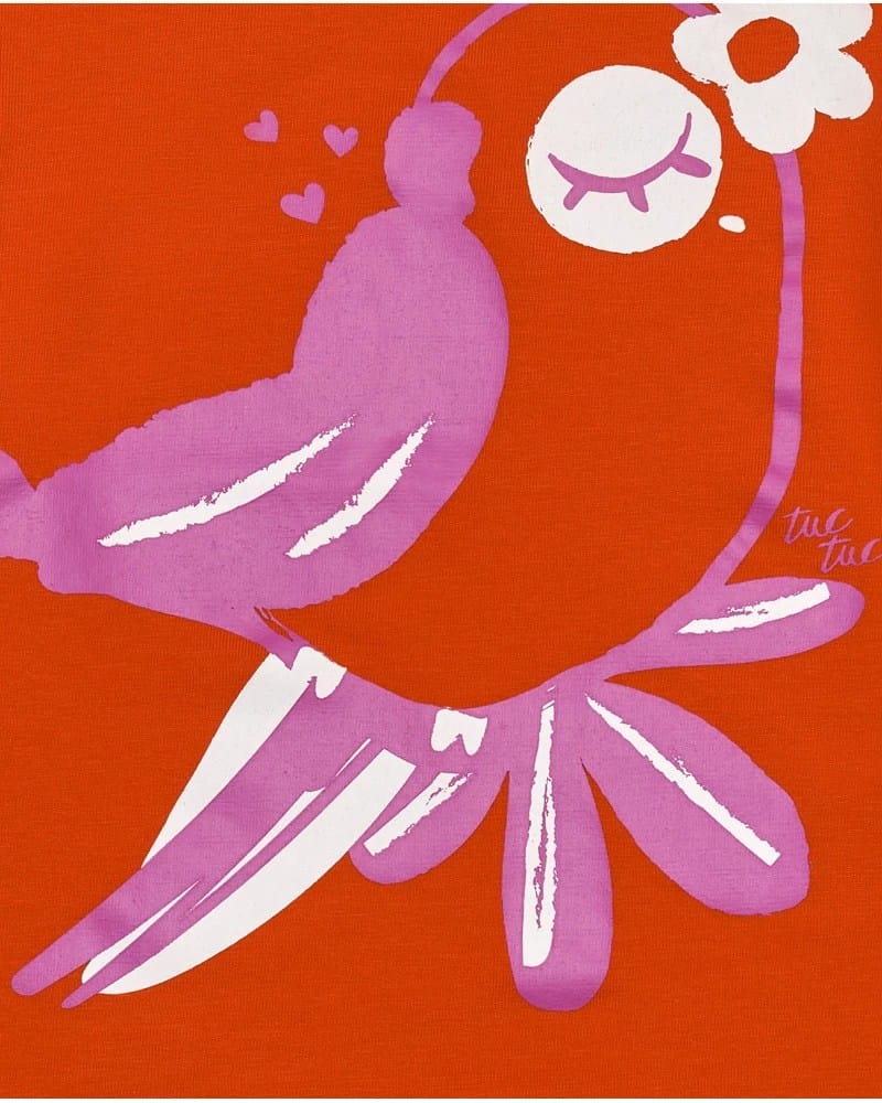 Lühikeste varrukatega oranz T-särk tüdrukutele, mille keskel on lilla ja valge linnupilt.