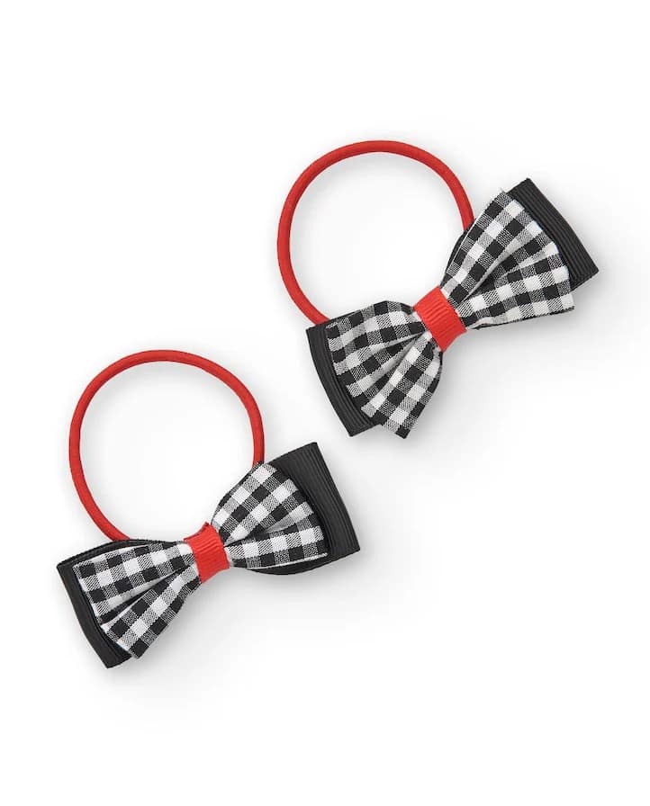 Mustvalge ruudumustriga lipsuga juuksekummide pakk, mida täiendavad punased detailid. Need aksessuaarid sobivad ideaalselt igale soengule elegantse ja peene ilme lisamiseks, hoides teie juuksed stiilsena. Ideaalne erinevate stiilidega kombineerimiseks.