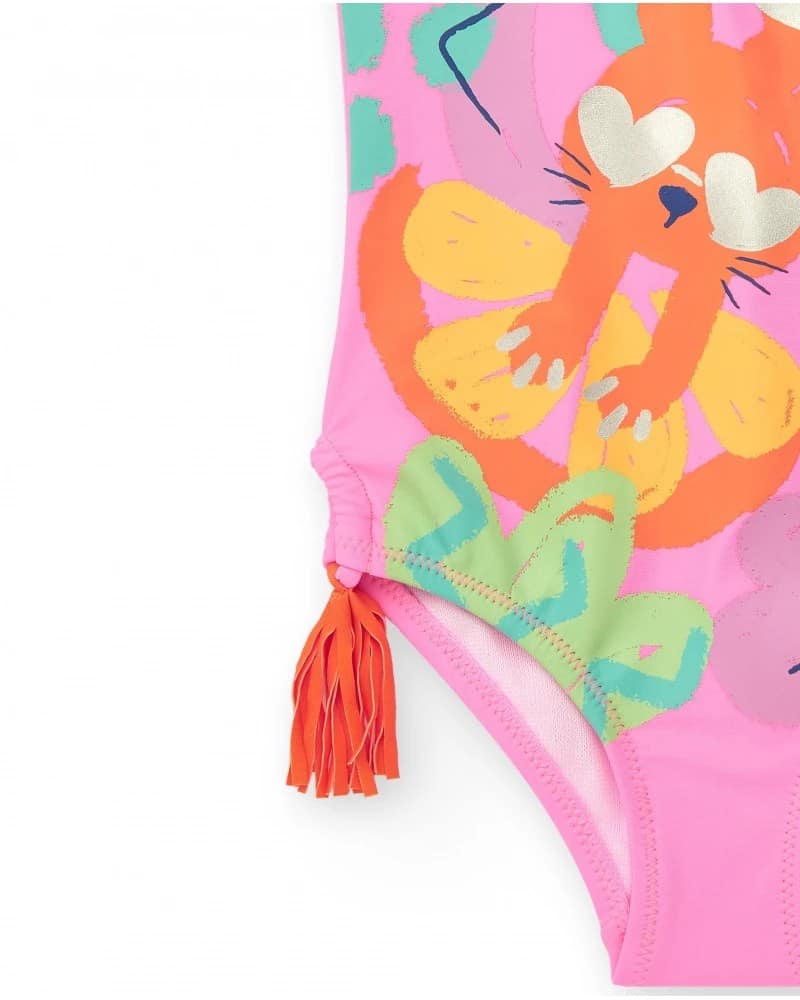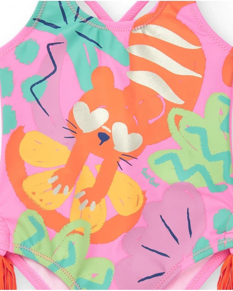 Tüdrukute erkroosa ujumistrikoo troopilistest loomadest inspireeritud mustriga. Külgedel on tutidetailid ja seljal risti asetsevad rihmad kindla ja mugava istuvuse tagamiseks.