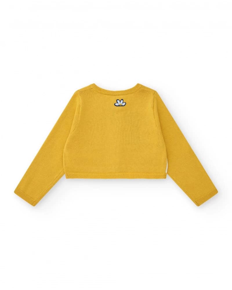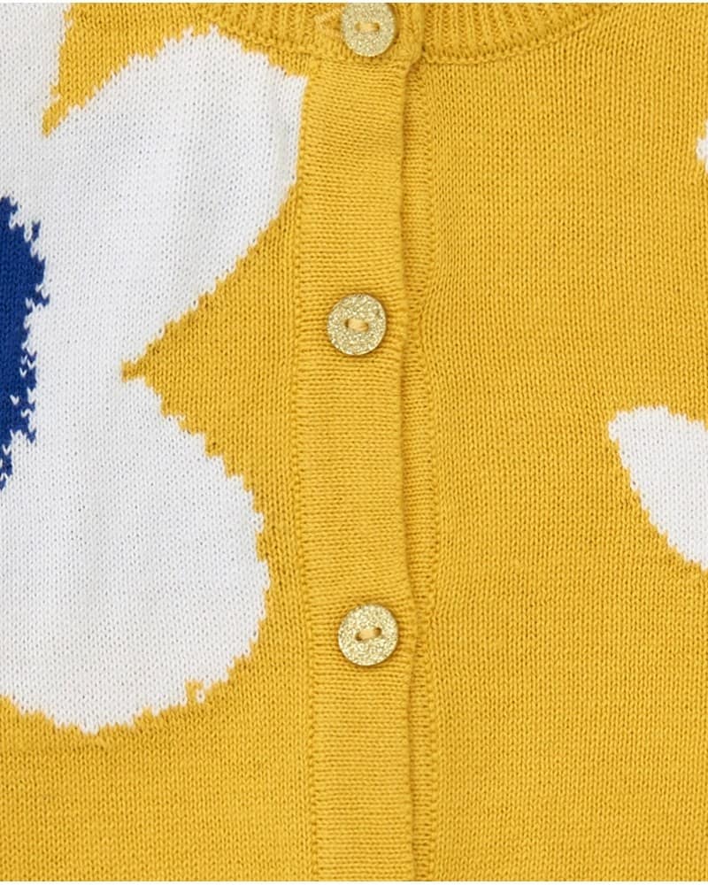 Tüdrukute kollane kardigan lillelise disainiga valge ja sinise värviga. Sellel on eesmine nupuga suletav praktilisus ja mugav istuvus.