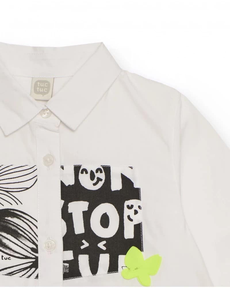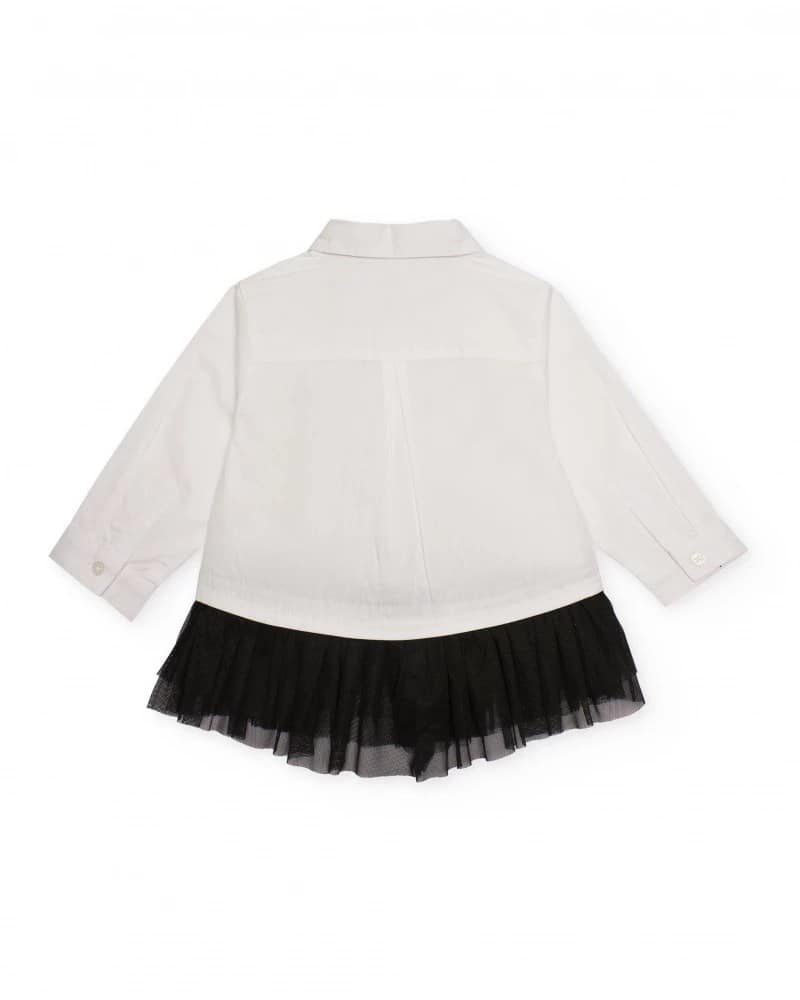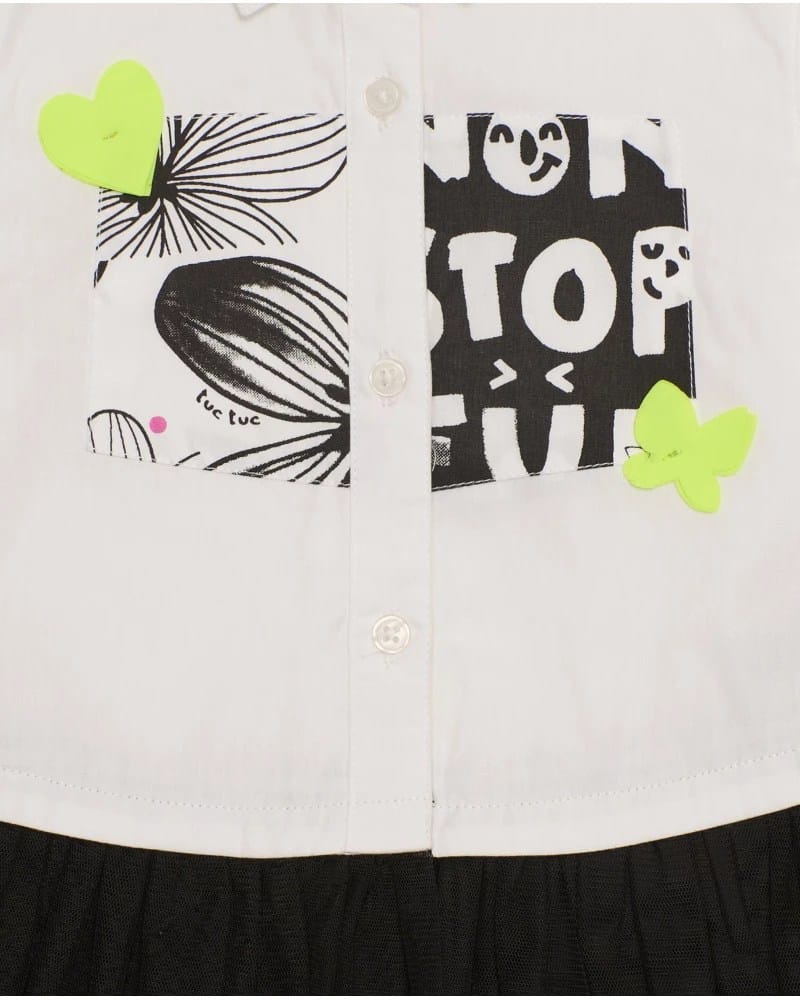 Tüdrukute pikkade varrukatega valge särk nööpkinnituse ja kraega. Musta tüllist seelikut meenutav äär annab ainulaadse ilme. Kaunistatud graafilise trükisega rinnal ning fluorestseeruvate roheliste südamete ja liblikatega.