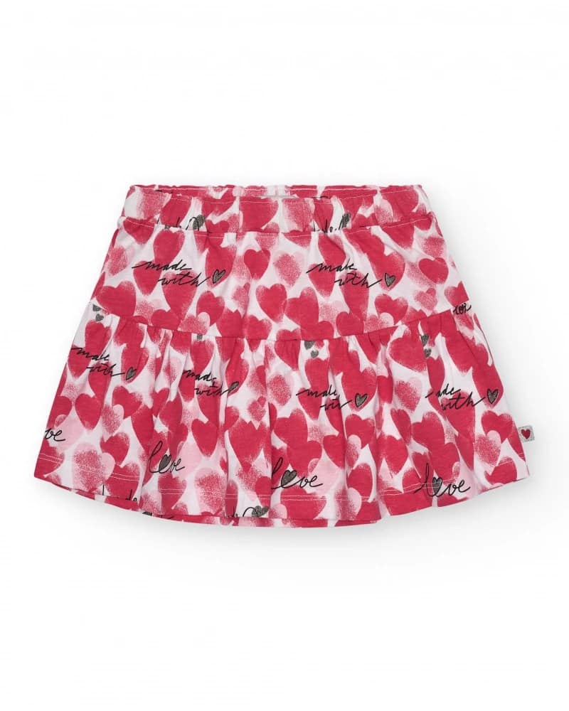 Punane südamekujulise mustri ja dekoratiivsete fraasidega seelik tüdrukutele. Lainetava lõikega ja kihilise mustriga.