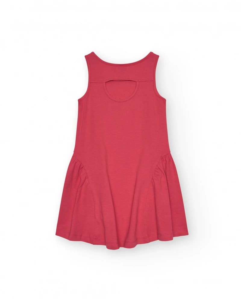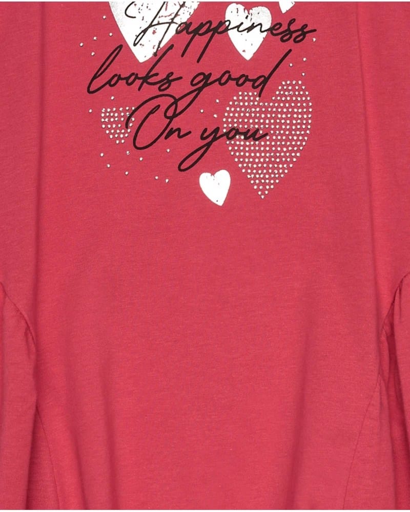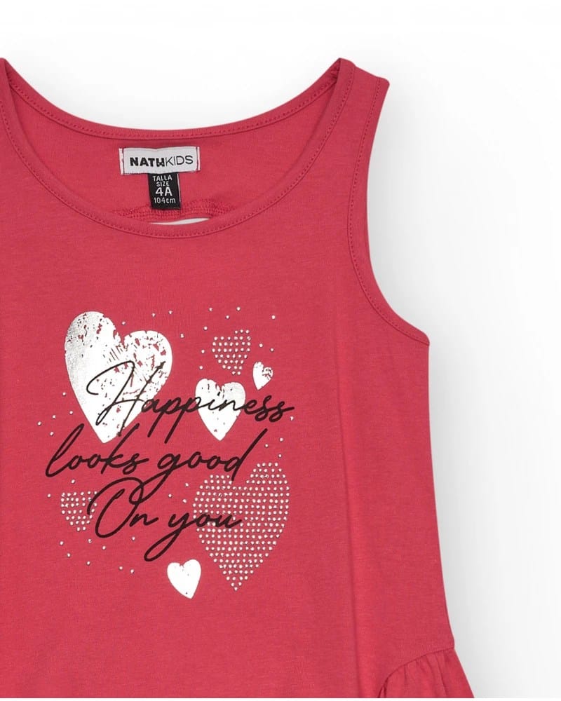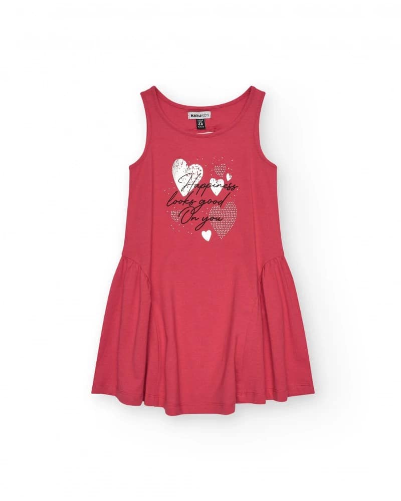 Tüdrukute punane varrukateta kleit südamekujulise trüki ja keskel oleva tekstiga.