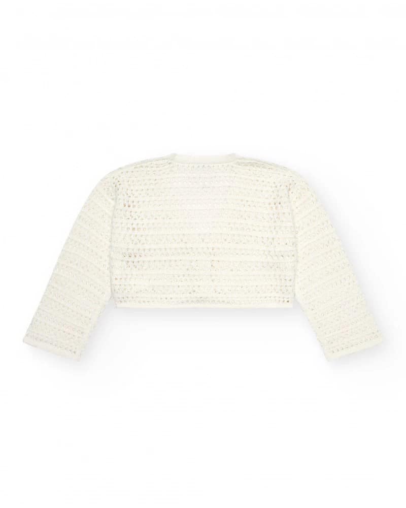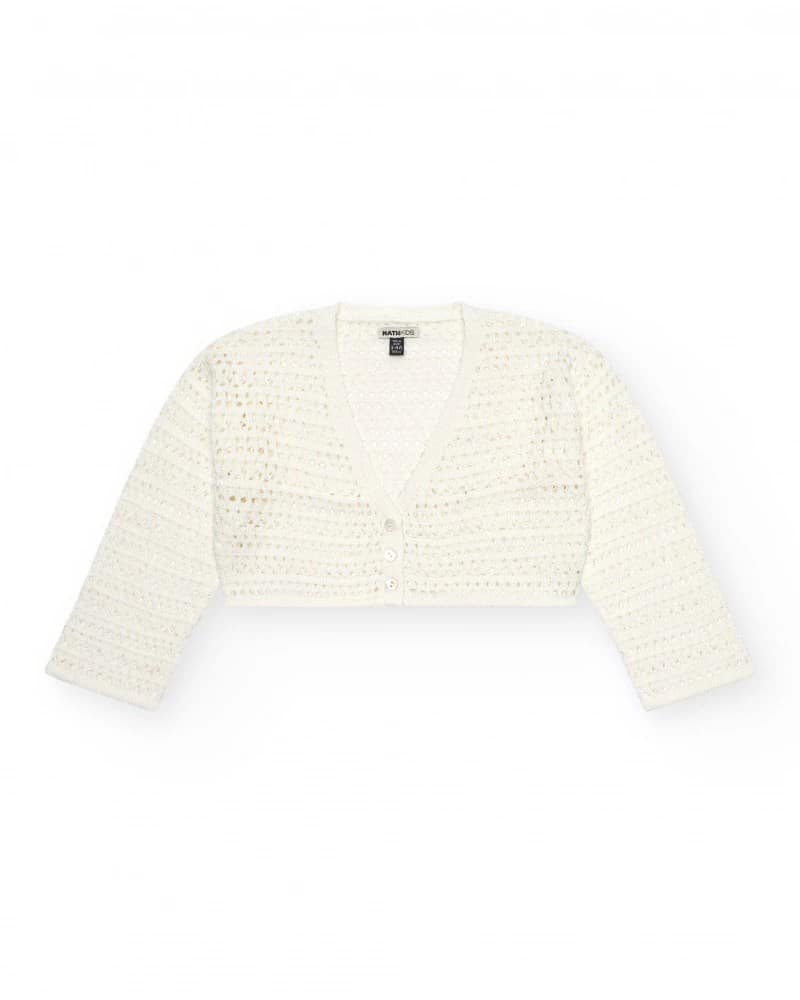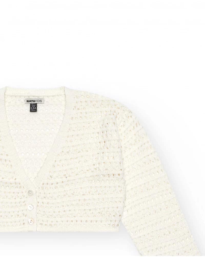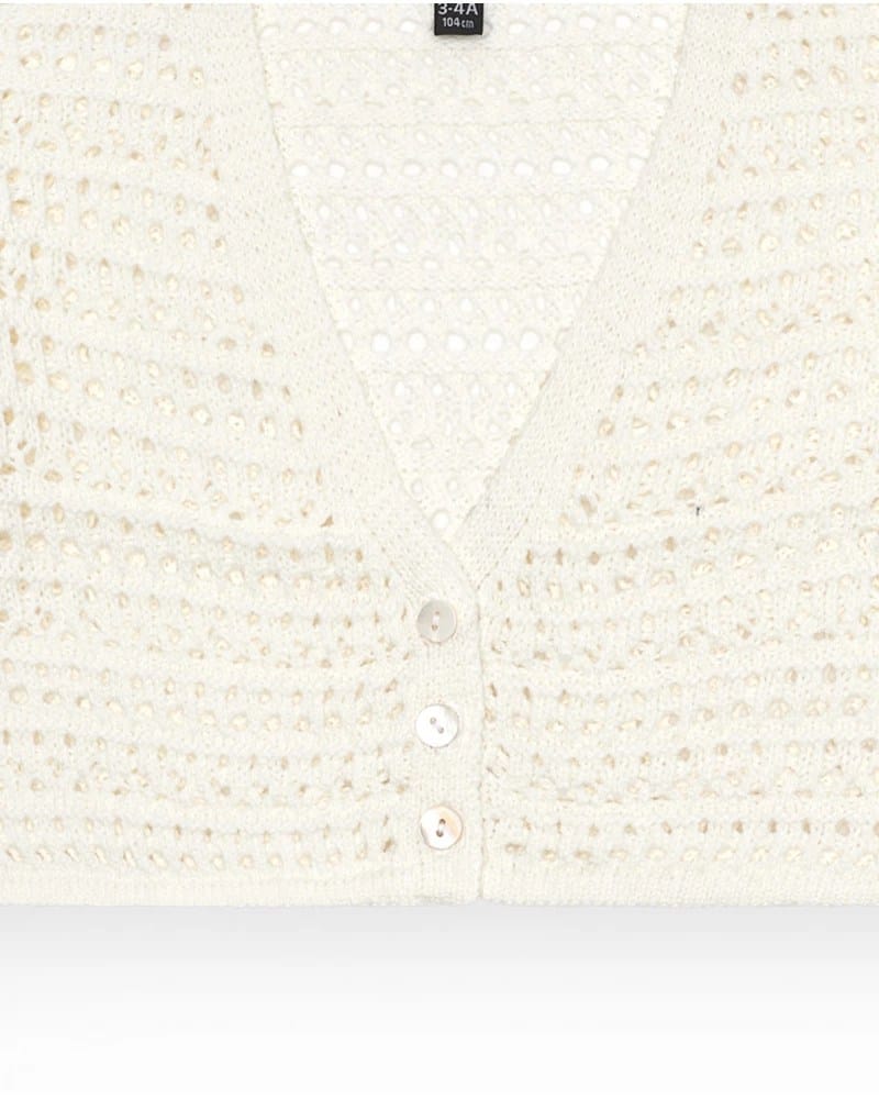 Tüdrukute valge kardigan ažuursest kangast. Ees on nööpkinnis mugavaks kandmiseks.