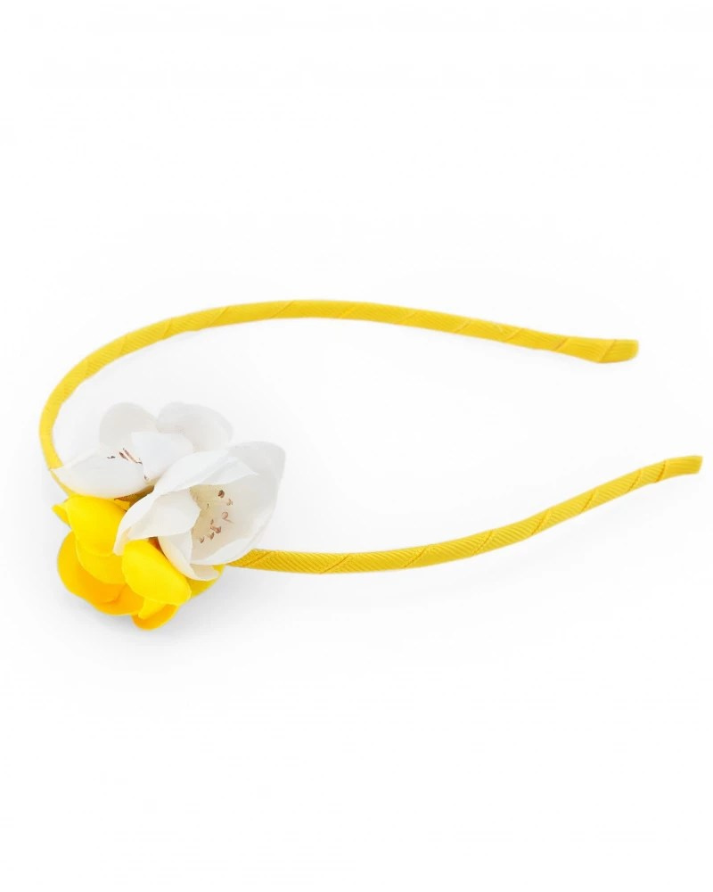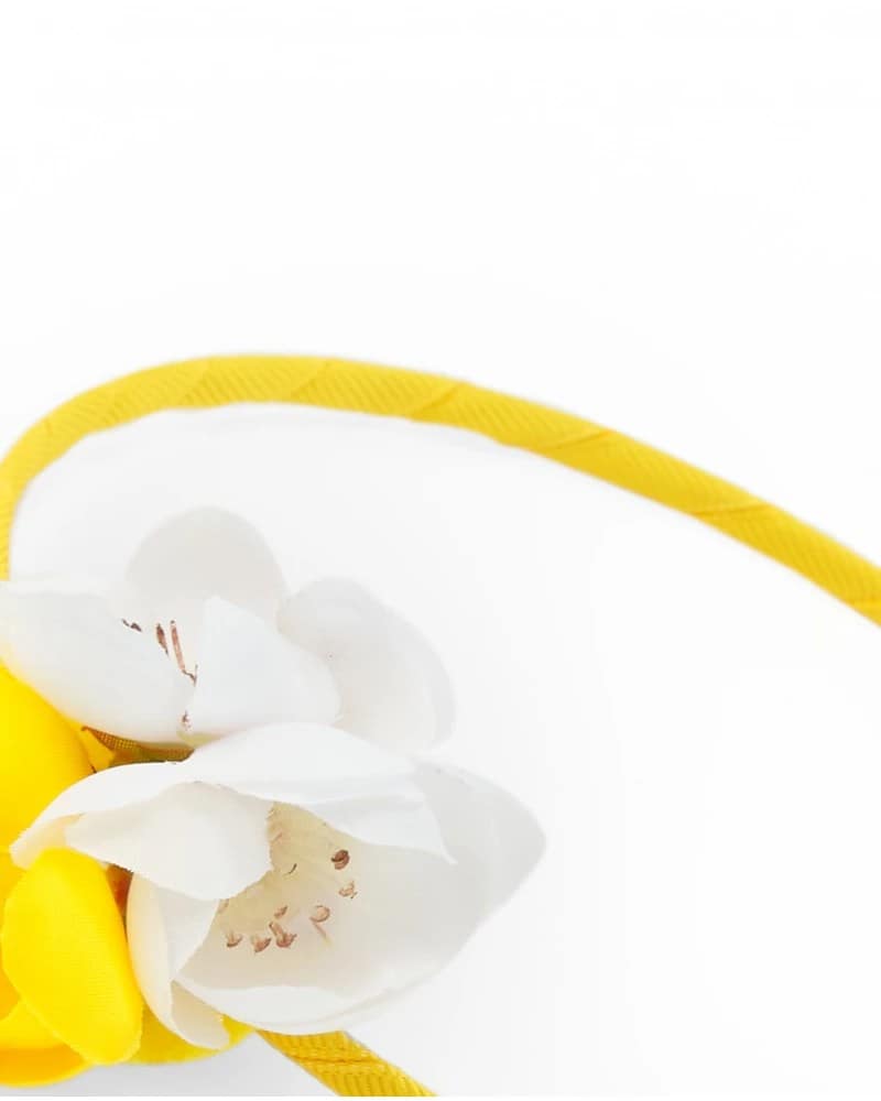 Tüdrukutele mõeldud jäik kollane peapael- diadema, mis on kaunistatud valgete ja kollaste lilledega.