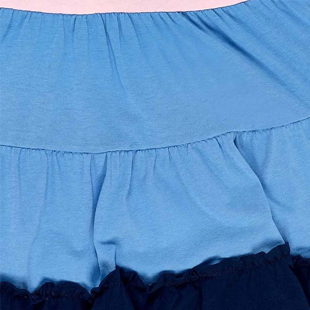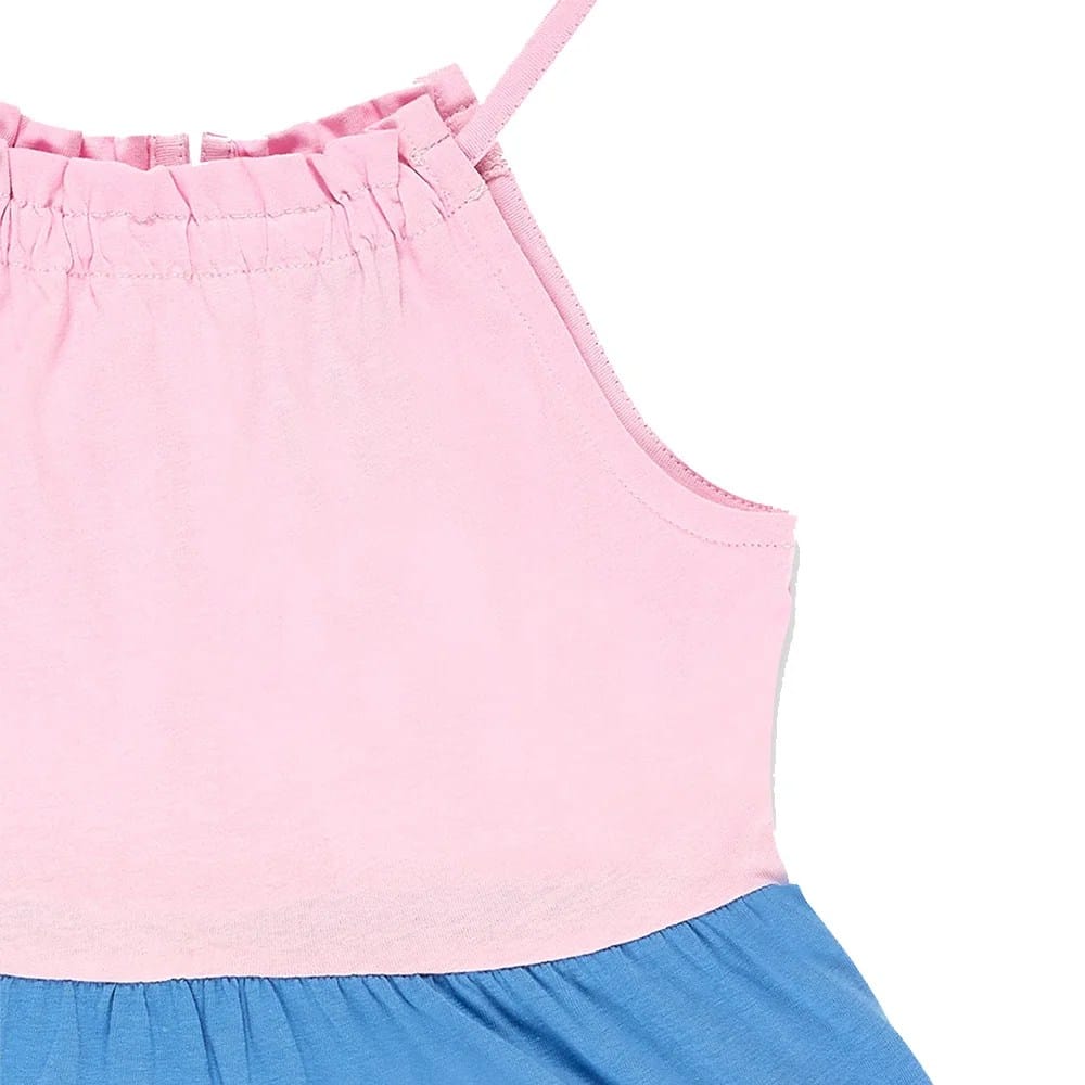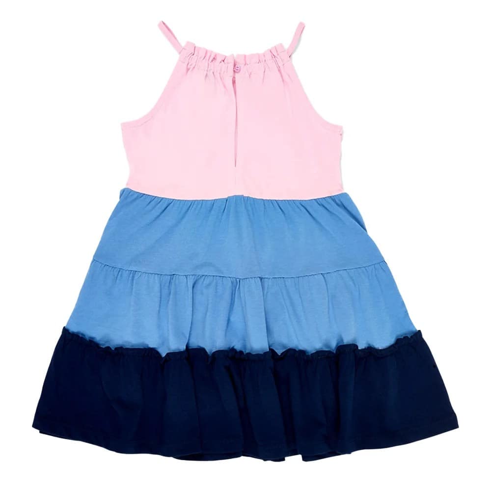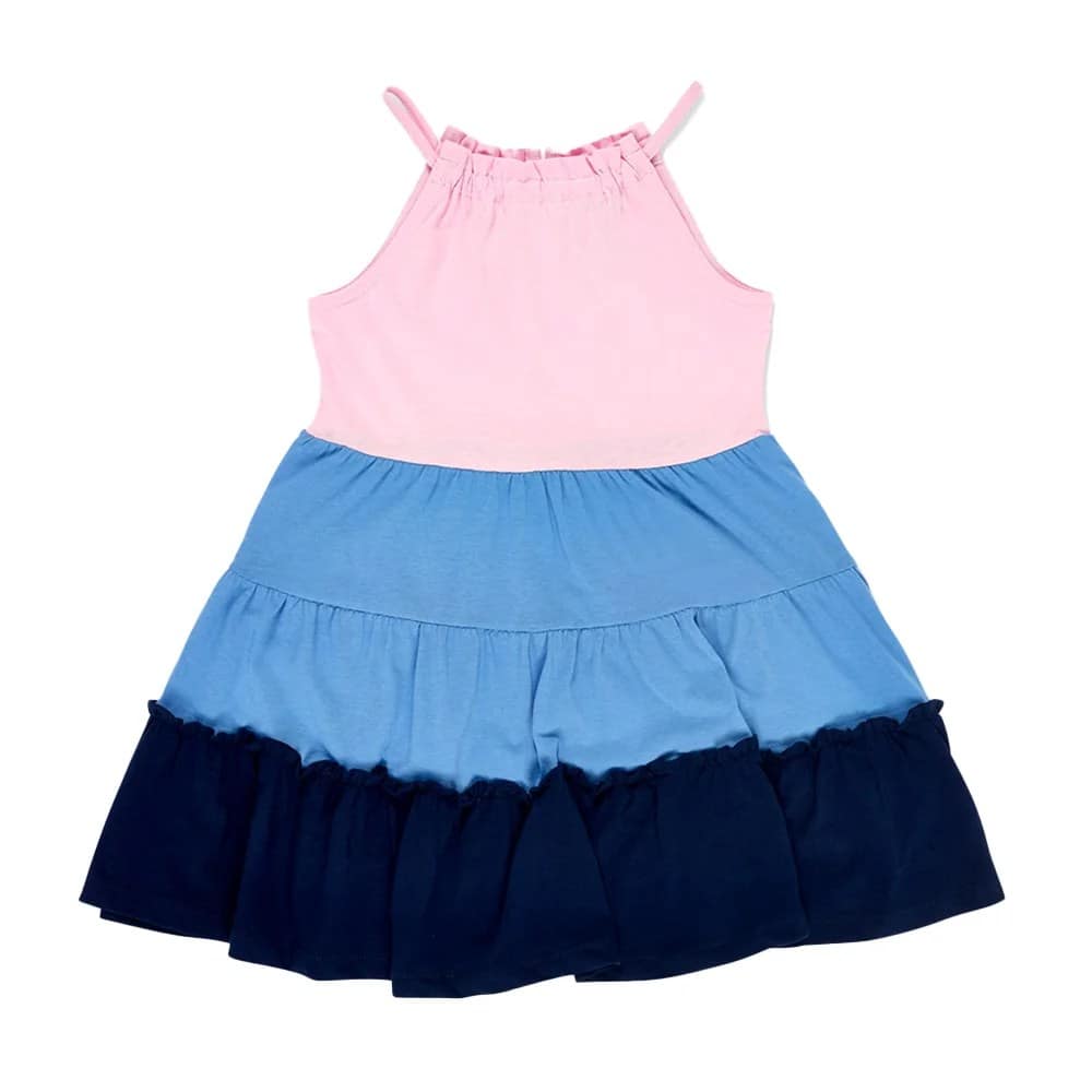 Tüdrukutele mõeldud kootud õlapaeltega kleit roosade, siniste ja tumesiniste triipudega.