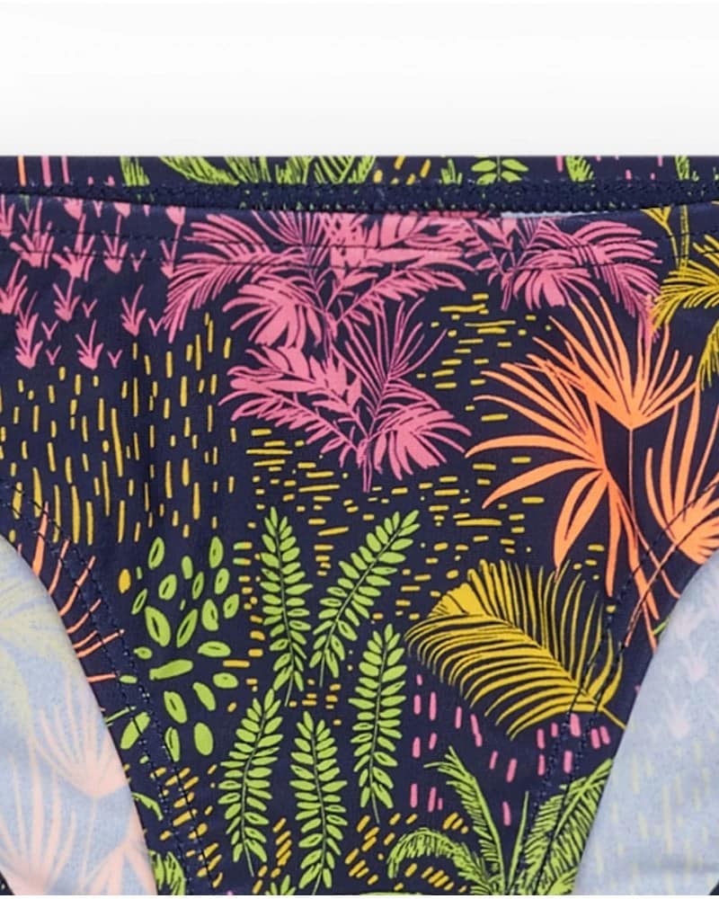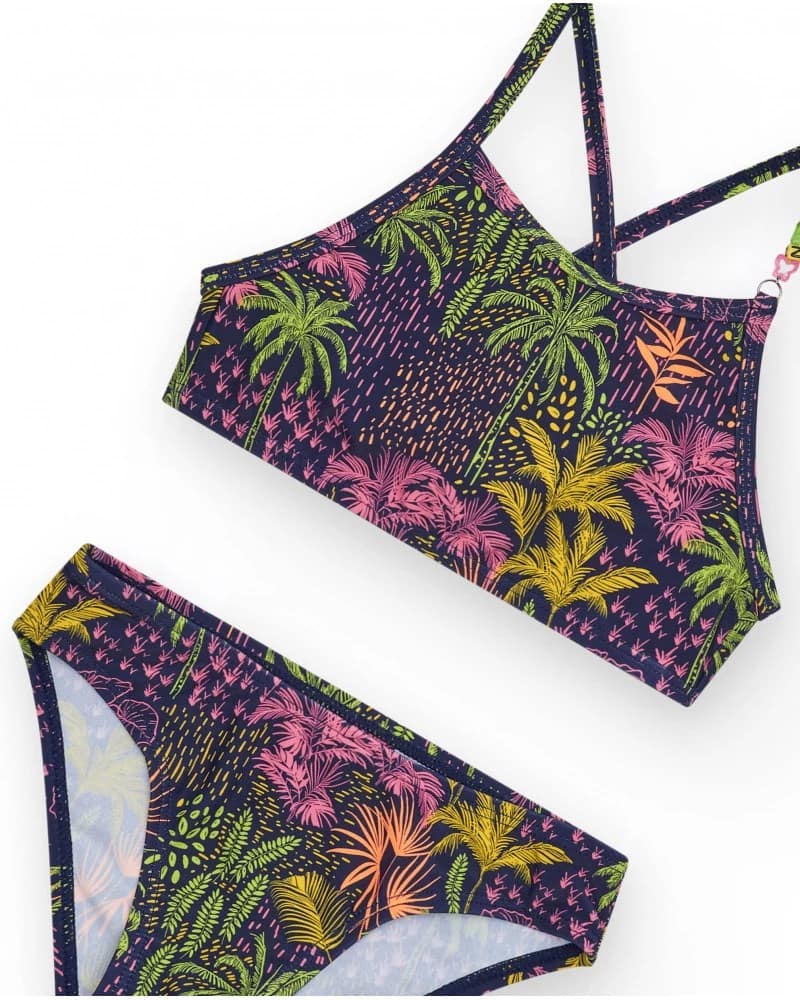 Tumesinine bikiinid tüdrukutele troopilise mustri ja risti asetsevate õlapaeltega, mis on kaunistatud värviliste helmestega.