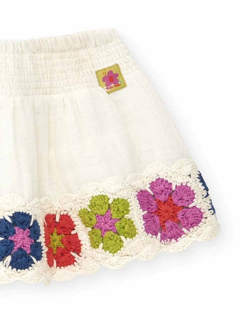 Valge pidu seelik tüdrukutele, mille allääres on mitmevärvilised heegeldatud detailid ja elastne vöökoht mugavuse ja hõlpsa istuvuse tagamiseks.