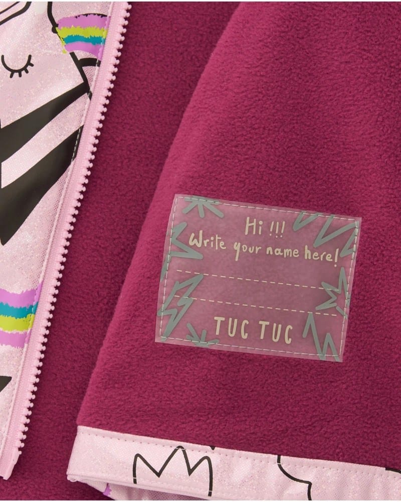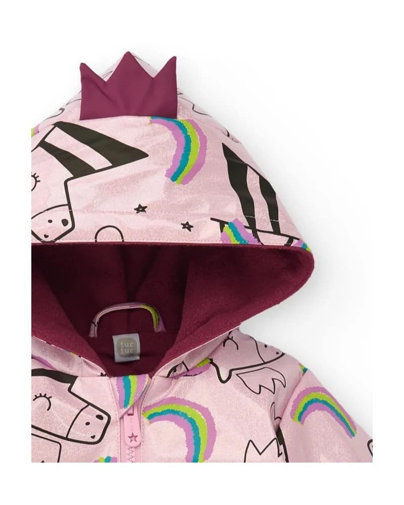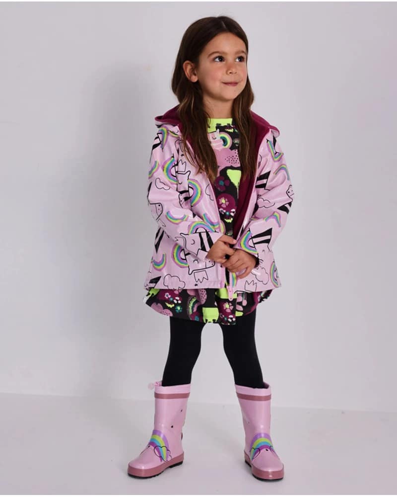 Heleroosa tüdrukute veekindel jope, millel on üleni ükssarvikute, pilvede ja vikerkaarte kujutav muster. Valmistatud vetthülgavast tehnilisest kangast pehme fliisvoodriga. Jopel on dekoratiivse krooniga kapuuts ja eesmine tõmblukk. Ideaalne vihmasteks ilma stiilist loobumata.