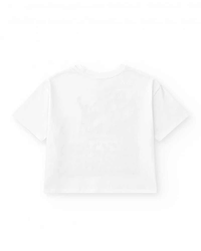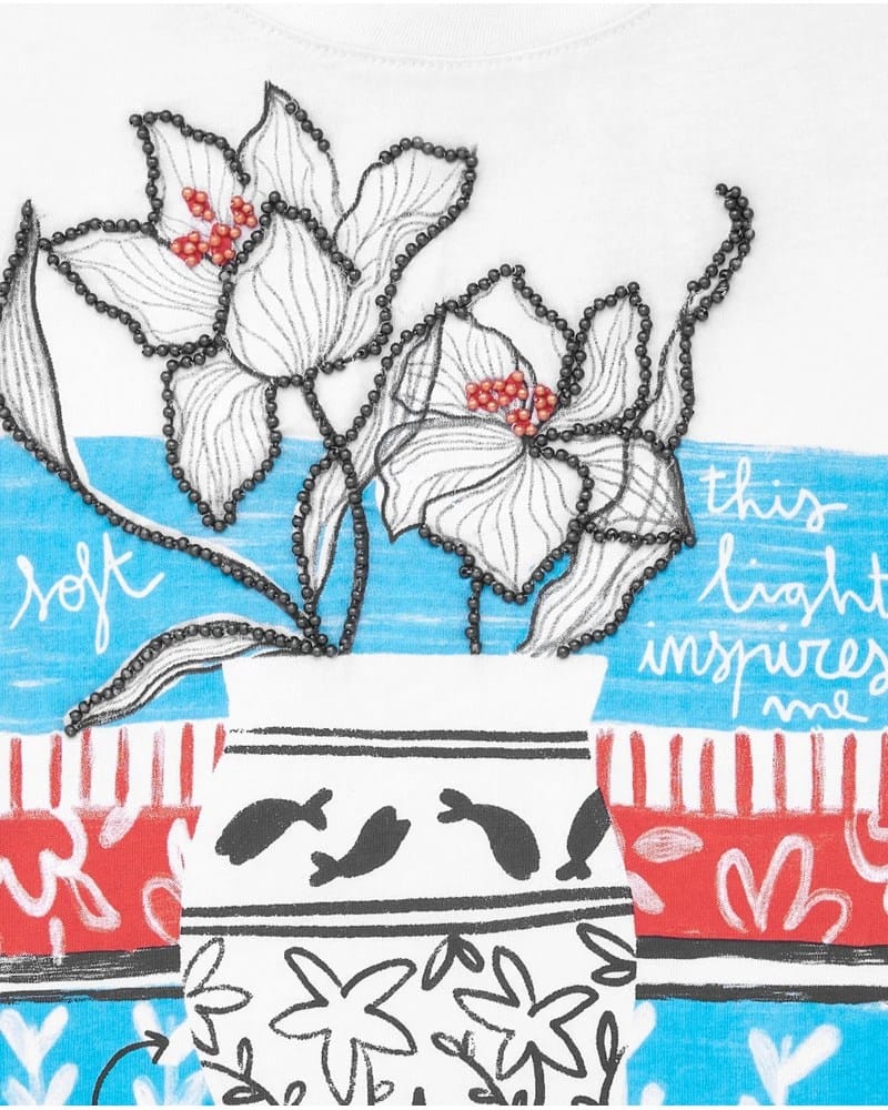 Tüdrukute lühikeste varrukatega kootud T-särk valges värvitoonis erksa lillelise mustriga ja tikitude lilledega. Eesküljel mitmevärviline lilleprind. Sirge lõikega ja ümara kaelusega mugav ja suvine stiil.
