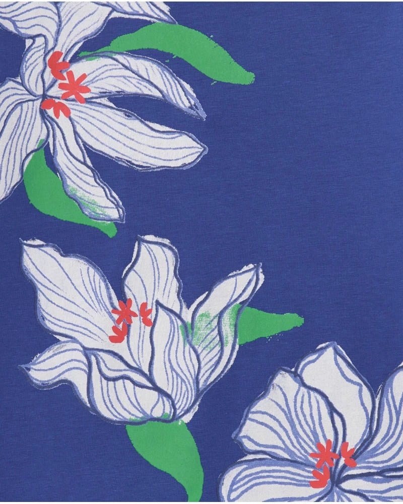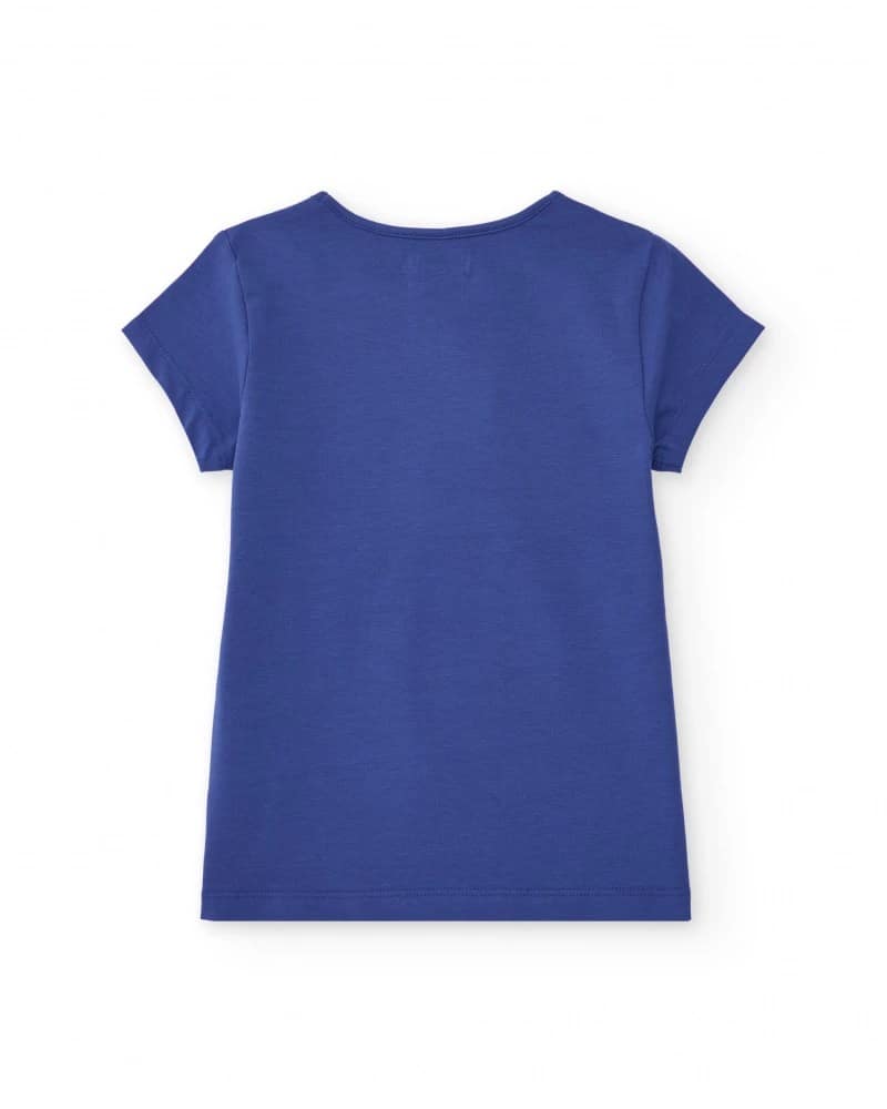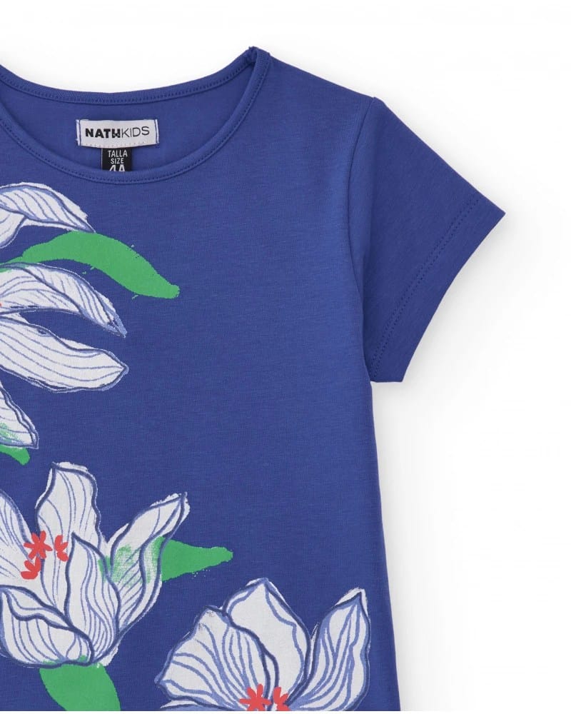 Lühikeste varrukatega sinisest tüdrukute T-särk. Eesküljel mitmevärviline lilleprind. Sirge lõikega ja ümara kaelusega mugav ja suvine stiil.