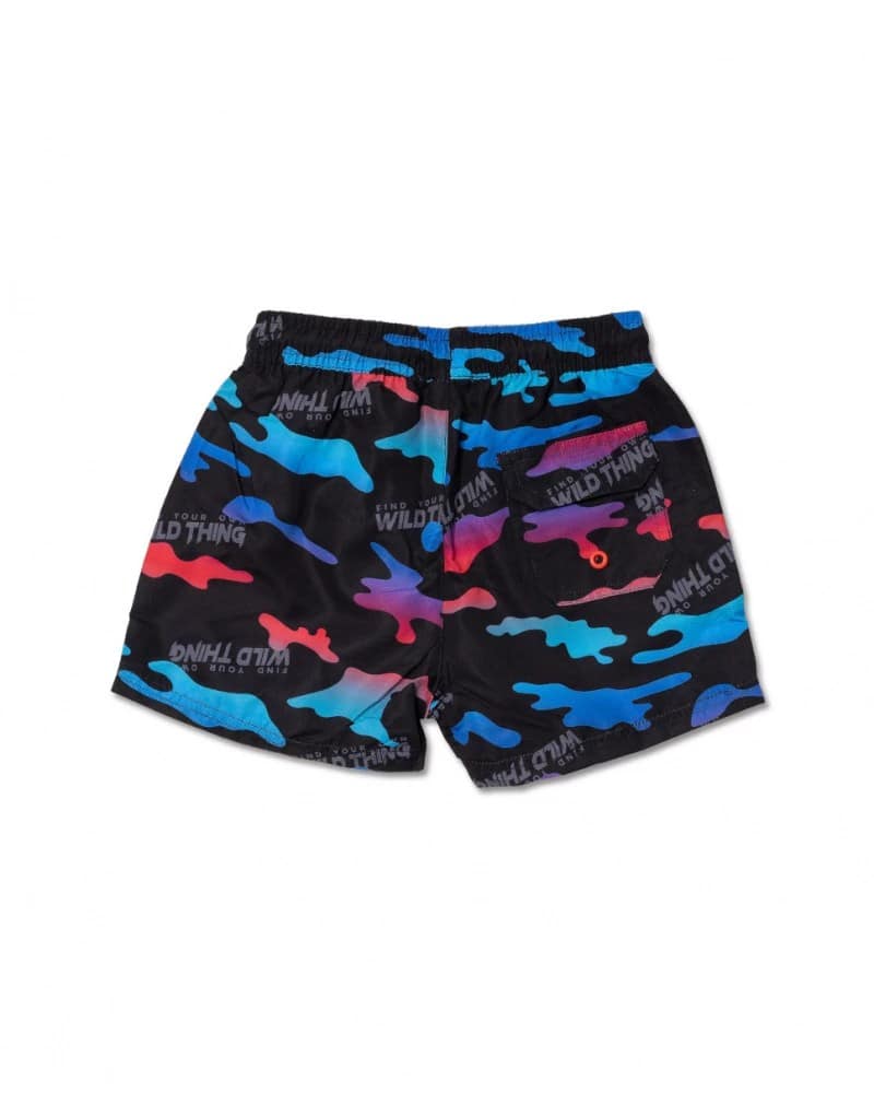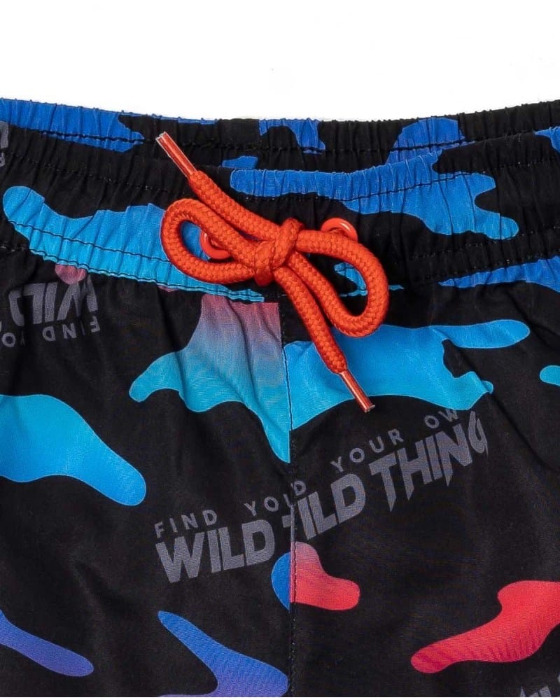 Mustad Bermuda stiilis ujumispüksid värvilise kamuflaažtrüki ja punase pingutusnööriga poistele.