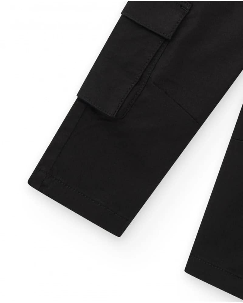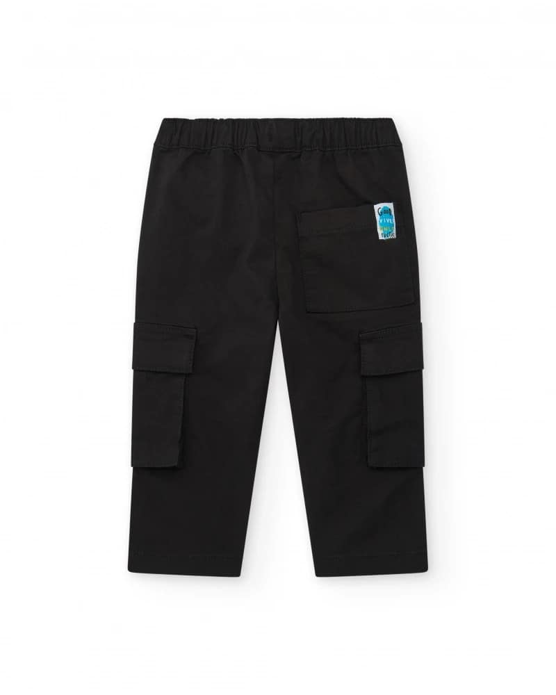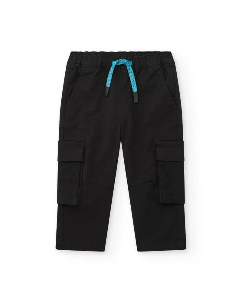 Mustad poiste cargo-püksid küljetaskute ja reguleeritava sinise pingutusnööriga vöökohaga. Mugav ja praktiline disain, ideaalne igapäevaseks kandmiseks.