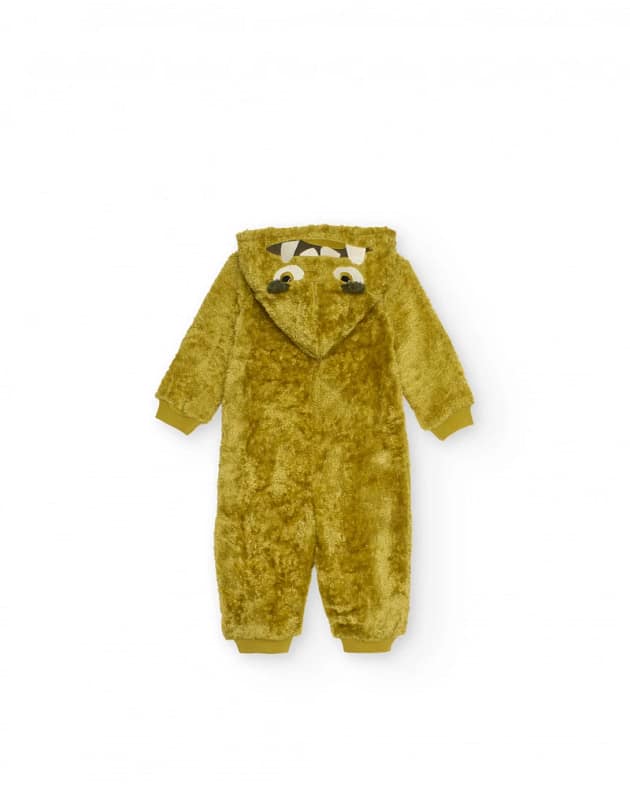 Poiste pikad kapuutsiga onesie-pidžaamad on valmistatud ülipehmest, lühikese karvaga sünteetilisest plüškangast. Rõivas on ühendatud oliivrohelise või tumeda sinepikarva värviga kehal ja varrukatel ning keskse ovaalse tükiga esiküljel, mis on varjundiga militaarroheline või tumedam ja imiteerib kõhtu. Kapuutsil on tikitud koletise detail suurte silmade ja hammastega. Eristavaks elemendiks on see, et silmavalged ja hambad on tikitud pimedas helendava niidiga. Pidžaamadel on ees lukk, mis hõlbustab selgapanekut. Kätistel ja pahkluudel on kontrastses ühevärviline elastne ääris optimaalse sobivuse tagamiseks ja temperatuuri hoidmiseks.