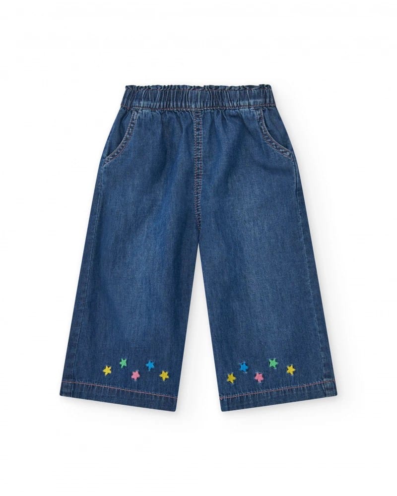 Sinisest teksariidest lamedad püksid tüdrukutele, allääres värvilise tikitud tähtti kandiga ja elastse vöökohaga.