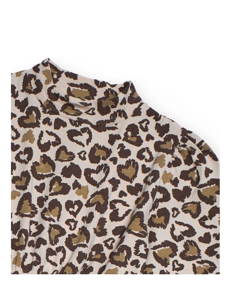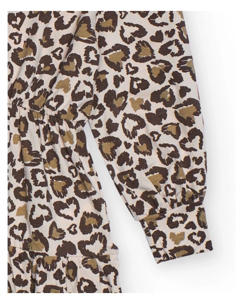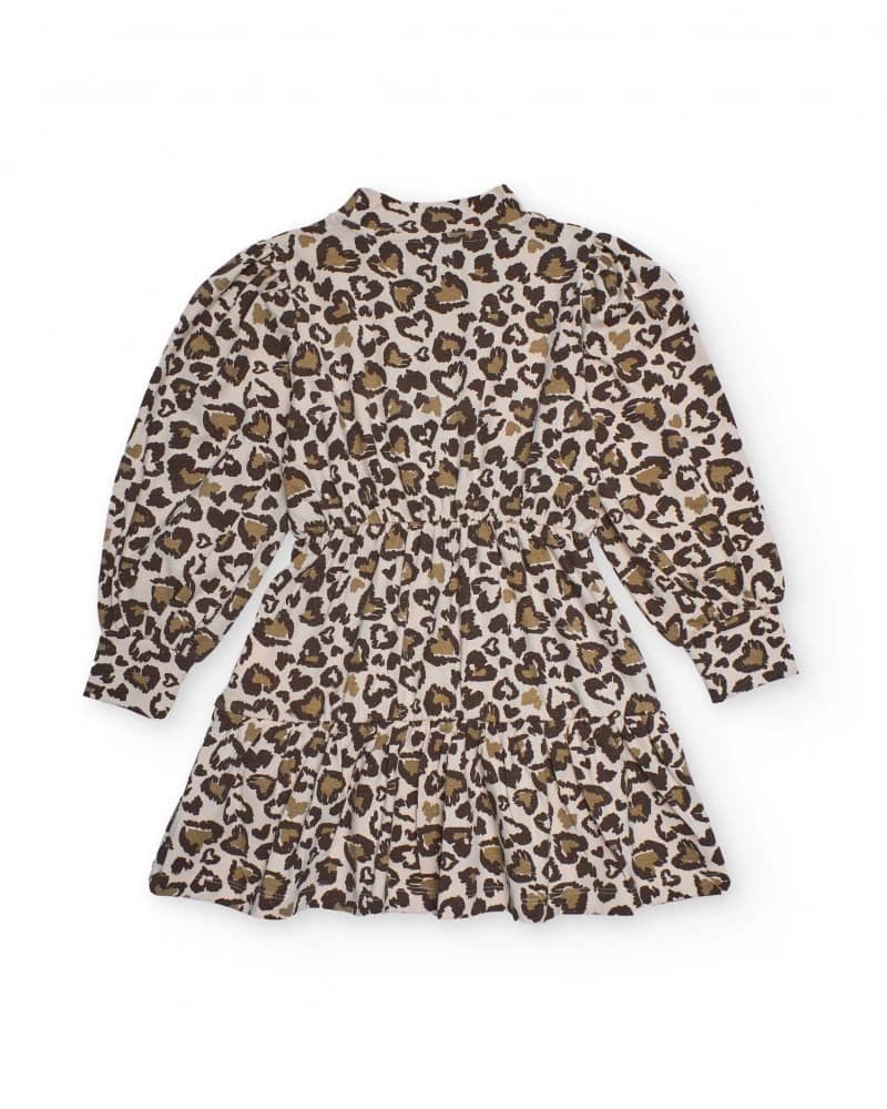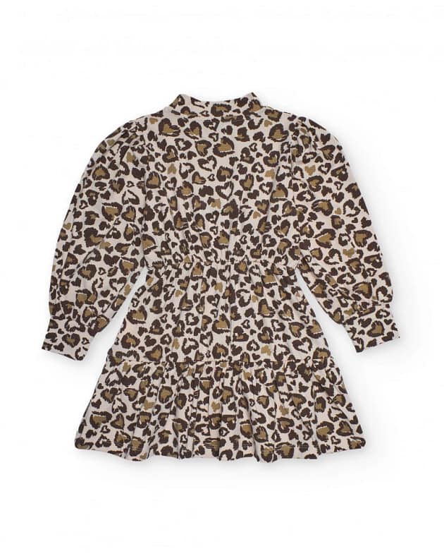 Tüdrukute kleit silmatorkava loomamustriga pruunides, beežides ja mustades toonides. Kleidil on pikad puhvis varrukad, millele on lisatud mansetid, kõrge kaelus ja mugava istuvuse tagamiseks elastne vöökoht. Topelt volangidega seelik lisab liikumist ja stiili, mis sobib ideaalselt nii erilisteks sündmusteks kui ka omanäoliseks igapäevaseks riietuseks.