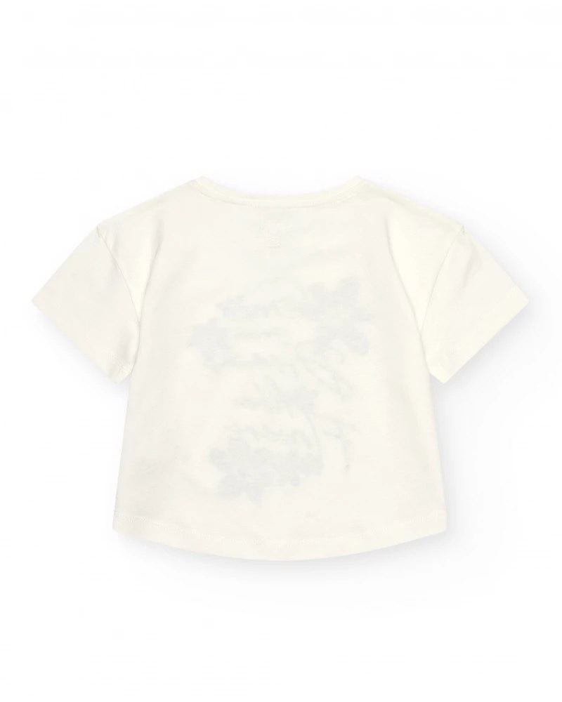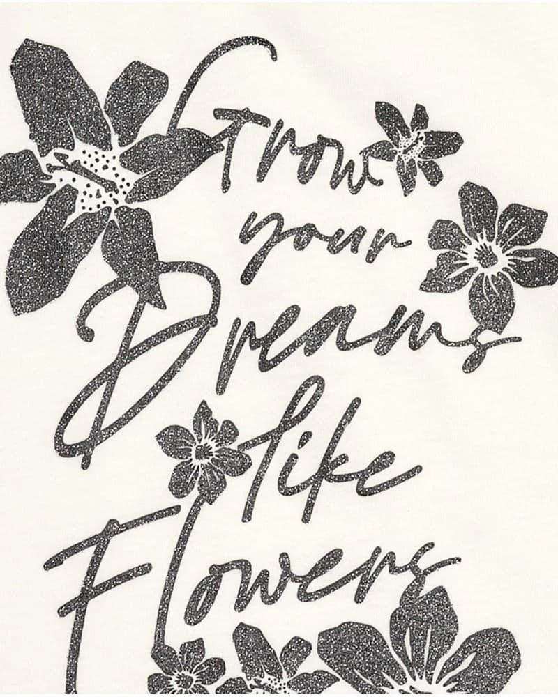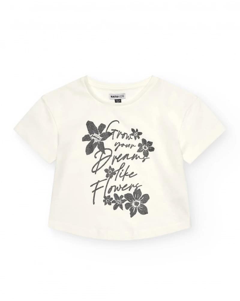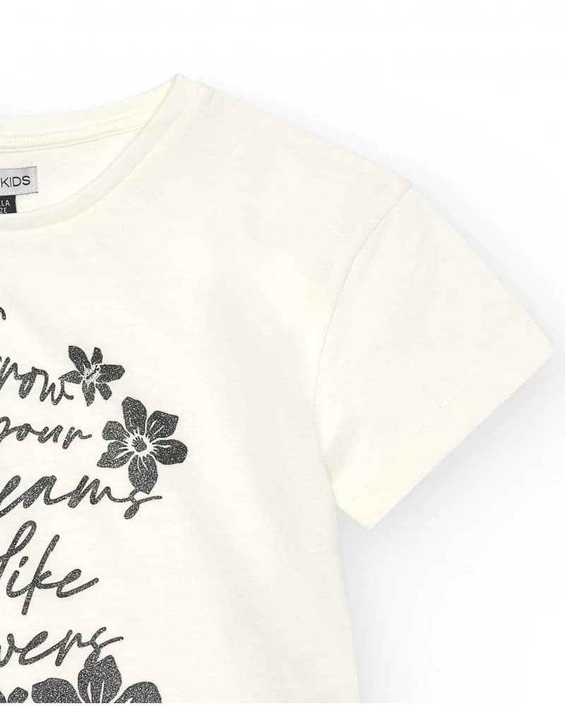 Tüdrukute lühikeste varrukatega valge pluus tumedates toonides lillelise mustri ja kirjaga “Kasvata oma unistusi nagu lilli”.