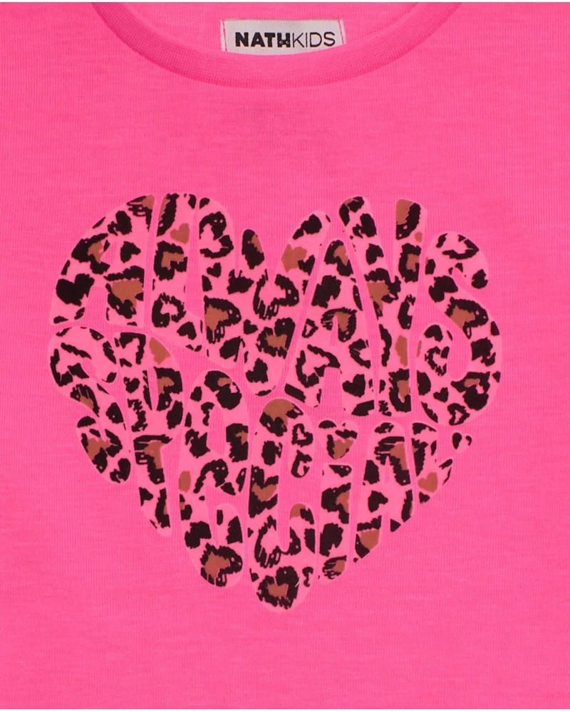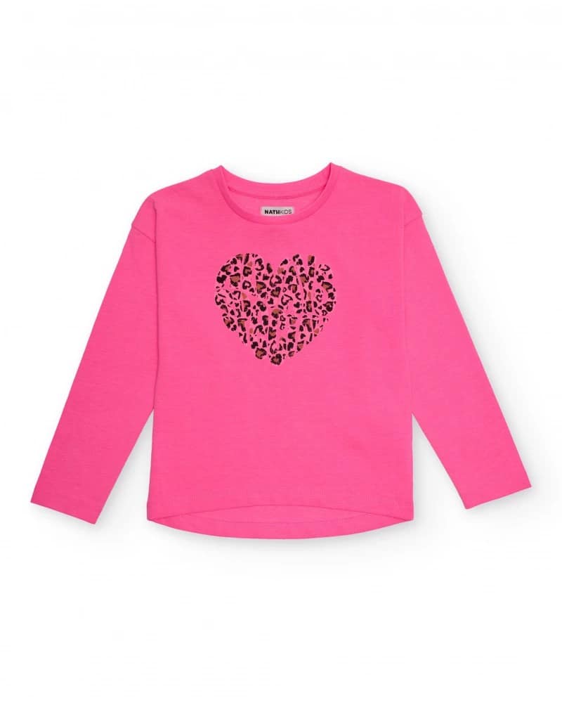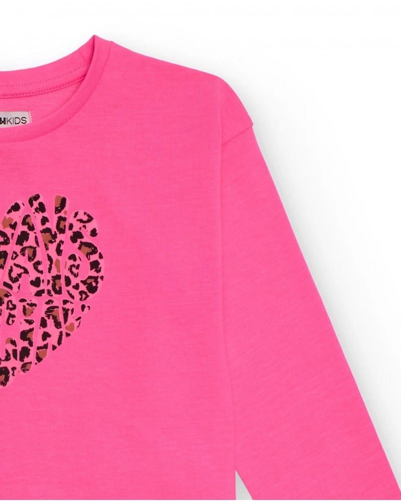 Tüdrukute pikkade varrukatega T-särk erksas fuksiaroosas toonis, valmistatud pehmest ja mugavast puuvillast. Keskel on südamekujuline ja pruunides ja mustades toonides loomamuster, mis lisab modernset ja mängulist hõngu. Ideaalne igapäevaseks kandmiseks, ühendades stiili ja mugavuse ühes rõivaesemes.