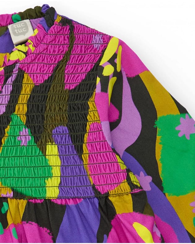 Tüdrukute popliinist kleit silmapaistva mitmevärvilise lilleprindiga fuksia, rohelistes, kollastes ja violetsetes toonides. Pikkade varrukatega, elastsete kätiste ja rinnal elastsuse ja mugavuse tagamiseks mõeldud läikega detail. Valmistatud kergest kangast, sobib ideaalselt igapäevaseks kandmiseks nii erilistel puhkudel.