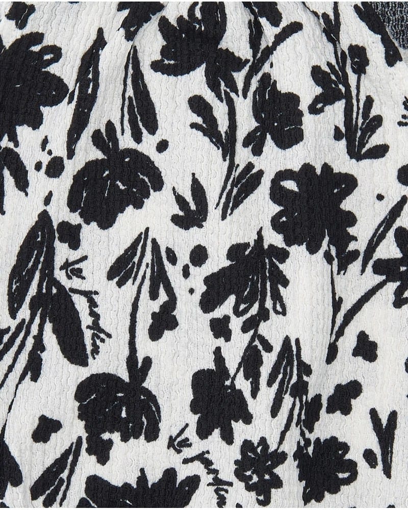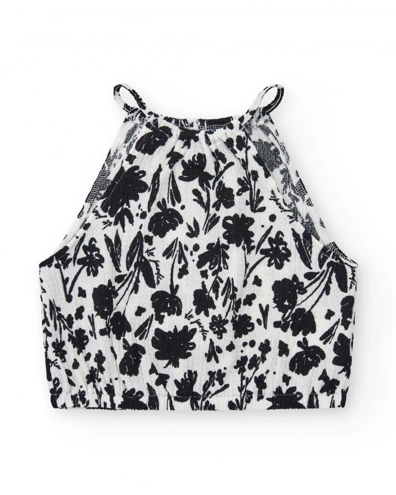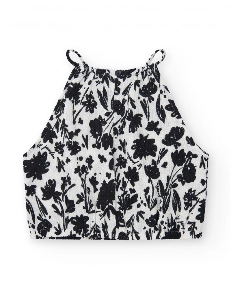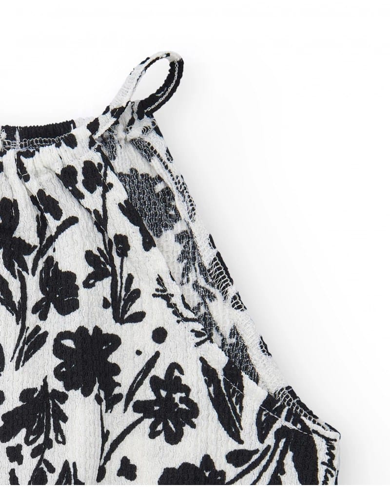 Tüdrukute valge pluus musta lilleprindiga. Disainitud peenikeste õlapaeltega ja mugava alläärega.