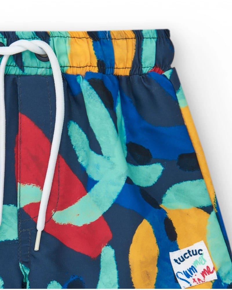 Tumesinised poiste ujumispüksid erksa mustri ja elastse vöökohaga, millel on pingutusnöör.